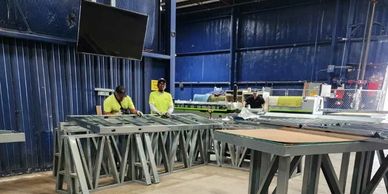 Wall panels are pre-assembled using labeled steel studs, fastened with screws or rivets. This off-site process improves speed, reduces waste, and ensures square, plumb assemblies ready for rapid field installation.